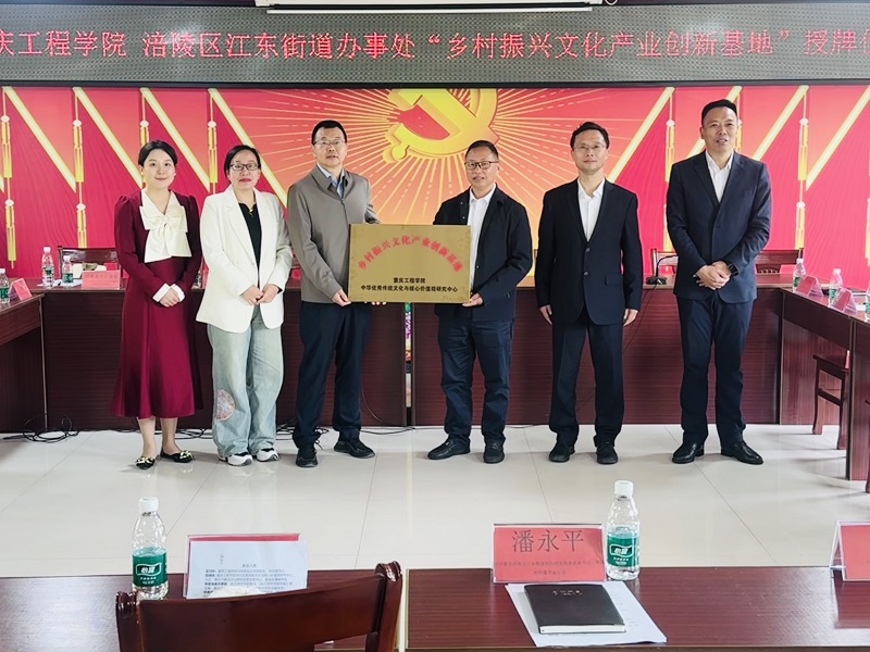 王巧玲介绍了学校办学情况,学校拥有与文化产业相关的技术和人才资源,希望通过与涪陵江东朝阳村的合作,实现资源共享和优势互补,共同推进文化产业发展。岳精柱对移民文化、巴渝文化、专家团队进行详细介绍,介绍了合作内容和设立“乡村振兴文化产业创新基地”目的和意义,并表示诚挚感谢。随后,举行了重庆工程学院中华优秀传统文化与核心价值观研究中“乡村振兴产业创新基地”的授牌仪式。