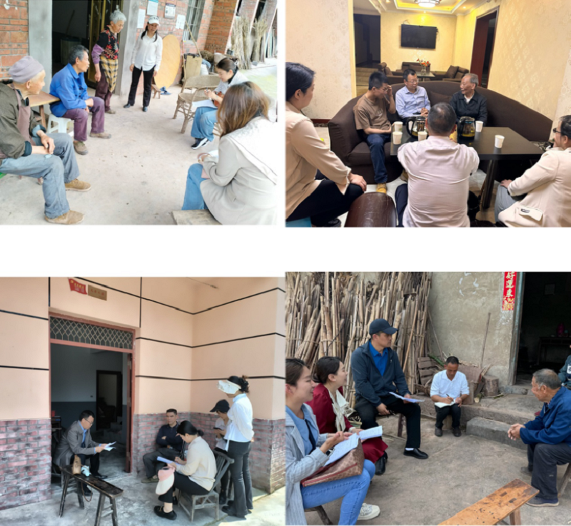 会后,一行人分组对朝阳村辖区5个农业小组进行抽样访谈和问卷调查。在调研过程中,与村民进行了交流,询问了当地的民风乡俗、返乡创业情况等,听取了他们对乡村振兴的期望和建议。特别访谈了90岁高龄的吴学高老人,聆听了他对朝阳村传说故事及部分文化遗址的介绍。