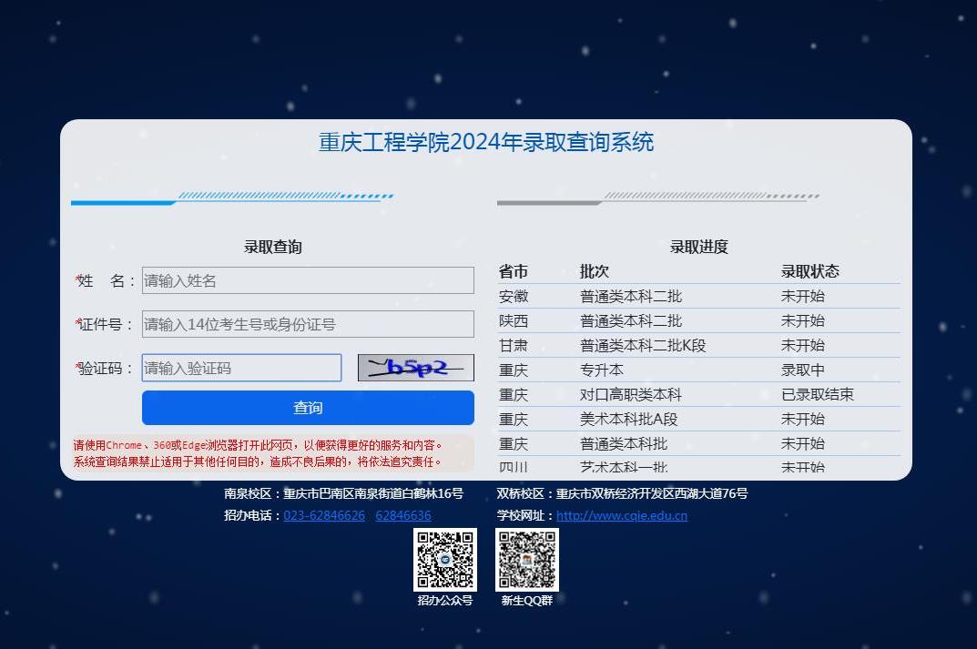 为让考生及时了解录取结果,我校2024年各层次录取结果查询系统已开通,查询网址http://www.cqie.edu.cn:8092,目前正在进行的录取批次是专升本层次。考生可根据录取进程登录学校阳光招生网自主查询,请使用自己的14位考生号或身份证号码加姓名进行查询