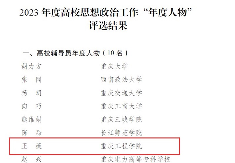 本网讯(文/图 党委宣传部)近日,市教委公布重庆市教育委员会公布了2023年度高校思想政治工作“年度人物”评选结果,我校软件学院辅导员兼学生第一党支部书记王薇榜上有名。作为重庆市民办高校唯一上榜的辅导员,王薇13年辛苦耕耘辅导员工作一线,不断探索双向奔赴、共同幸福成长的育人模式。