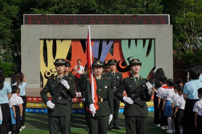 本网讯(文/图 武装部 朱文韬)6月5日,巴南区大江小学一场“重庆工程学院国旗护卫队进校园”爱国主义教育主题活动在这里举行。我校国旗护卫队队员向小朋友们展示了标准的升旗仪式,随后给孩子们上了一堂生动的国防教育课。