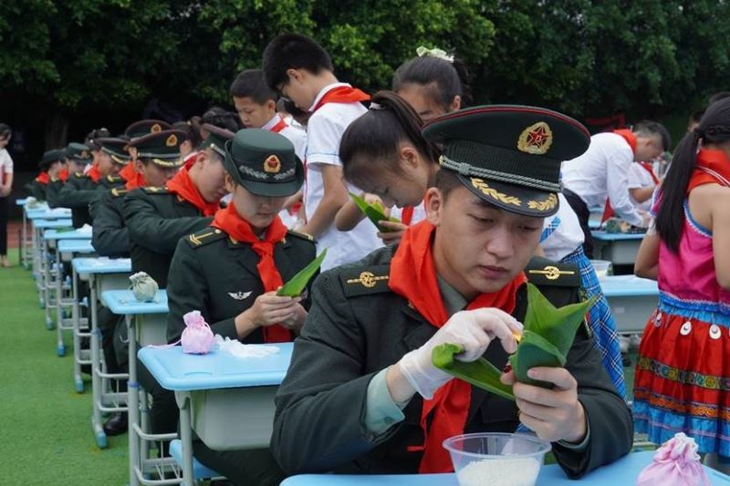 同时在一年一度端午节来临之际,为了深入推进文化自信教育,国旗护卫队的队员与大江小学的学生们一起进行了包粽子迎端午的活动,活动过程中大家都踊跃参与,积极学习如何包粽子,卷粽叶、放米、捆扎。国护队员谭钟桐在参与后表示,能和同学们一起通过包粽子来学习习俗文化是一件很有趣的事情,更是赓续文化传承的活动。最后大江小学校长与党委武装部领导分别发表讲话。