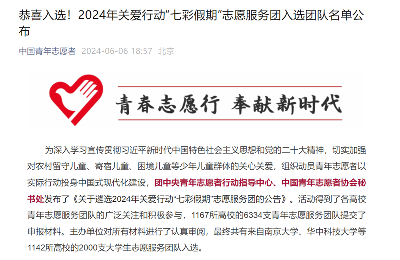 本网讯(文/图 大数据与人工智能学院 王惠俊)近日,团中央青年志愿者行动指导中心、中国青年志愿者协会秘书处发布了《关于遴选2024年关爱行动“七彩假期”志愿服务团的公告》。活动得到了各高校青年志愿服务团队的广泛关注和积极参与,1167所高校的6334支青年志愿服务团队提交了申报材料。最终,我校云智志愿服务队与来自全国1142所各大高校的2000支大学生志愿服务团队共同入选。