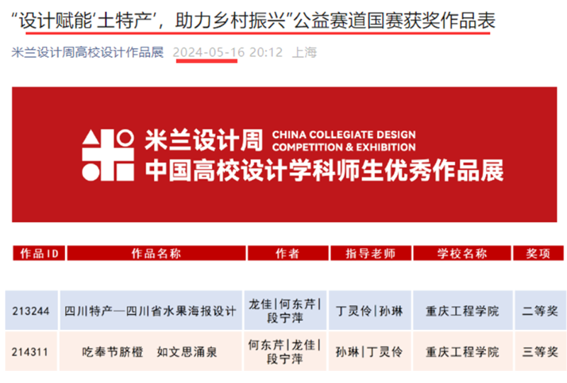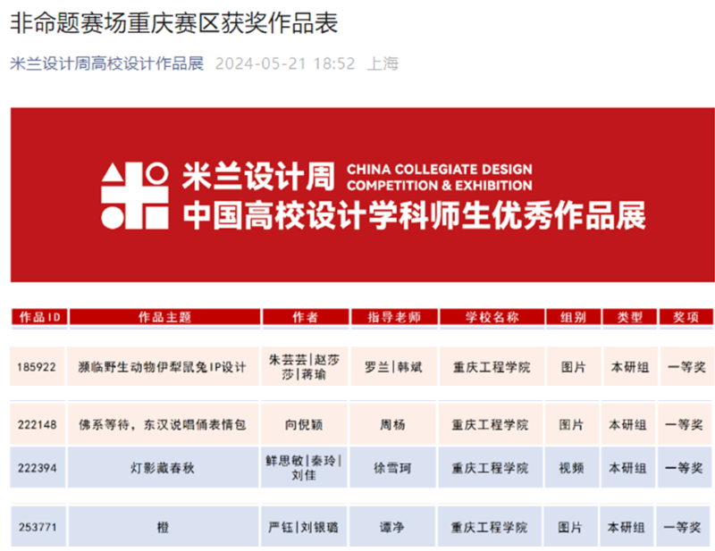 学院师生已连续参加该项大赛多届,获奖成果丰硕。在本届大赛中,我院师生再佳绩:获全国总决赛奖项5项,其中学生组二等奖2项,三等奖3项;重庆赛区奖项36项,其中学生组一等奖4项,二等奖5项,三等奖24项,教师组二等奖1项,三等奖2项。近年来,学院积极推进学科专业一体化建设,探索文化传承创新与专业融合特色发展之路,以赛促学,以赛促教,致力提升学生的设计创新实践能力和专业人才培养质量。