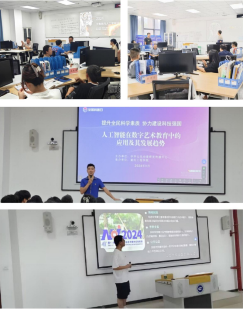 科技处联合大数据与人工智能学院分别组织了“计算机视觉技术”和“大数据与人工智能”两场科研沙龙活动,深入探讨了跨学科科研课题解决方案。中华文化动漫研发传播中心组织“人工智能在数字艺术教育中的应用及其发展趋势”专题科普讲座,分享了利用人工智能技术创作“巴文化动漫短视频”的创作经验。软件学院各社团分别开展系列科普活动:ACM协会赴巴南职业教育中心举办了主题为“科技启航,编程筑梦——信息时代下的科普之旅”活动,鸿蒙社团赴巴南区松花江小学举办“智能互联,鸿蒙启航”科普活动,红心支教团赴南温泉小学及百节小学举办“智慧扬帆,代码织梦”编程科普教育活动,VR社团举办“虚拟与现实的交汇——VR技术探索之旅”科普活动,ACM协会组织信息学竞赛活动,充分激发青少年对信息技术的热情。计算机与物联网学院开展“5G网络架构科普”活动,管理学院开展“基于新一代人工智能技术体系的AI产品研发”科普讲座,进一步开拓了师生科研视野。基础学院成渝地区大学物理实验虚拟教研室联合重庆物理学会举办“带你探索物理世界”科普活动,吸引一千余名人员参与互动。电子信息学院举行“翱翔天际,飞机制作”科普活动,带领学生感受中国航空科技发展的巨大成就。