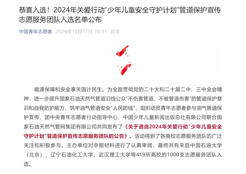 该活动包括来自北京化工大学、中国石油大学、重庆大学、西南大学等419所高校的1000支大学生志愿服务团队入选。团队将按照宣讲计划,认真准备宣讲内容,精心设计宣讲形式,扎实开展好2024年关爱行动“少年儿童安全守护计划”管道保护志愿宣讲服务。