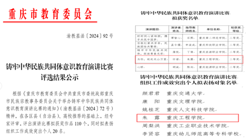 本网讯(文/图 管理学院 朱露)近日,重庆市教育委员会公布《铸牢中华民族共同体意识教育演讲比赛评选结果公示》,我校管理学院参赛选手许诺积极筹备、刻苦练习,在演讲比赛中赛出风格、赛出水平,最终获得演讲比赛二等奖,指导教师朱露获组织工作成效突出个人,为我校在本项赛事中取得突破。