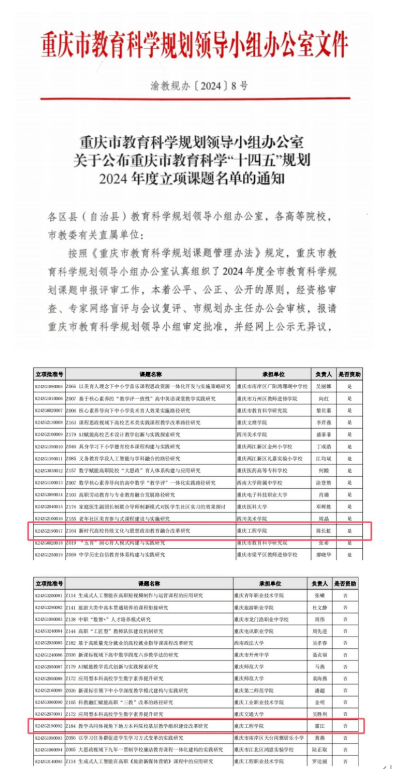 9月,我校共获得重庆市教育科学规划项目立项8项。其中党委书记陈长虹挂帅的《新时代高校传统文化与思想政治教育融合改革研究》、建筑工程学院院长雷江挂帅的《教学共同体视角下地方本科院校基层教学组织建设改革研究》2个项目获得重点立项,立项数质量均创近年来新高。