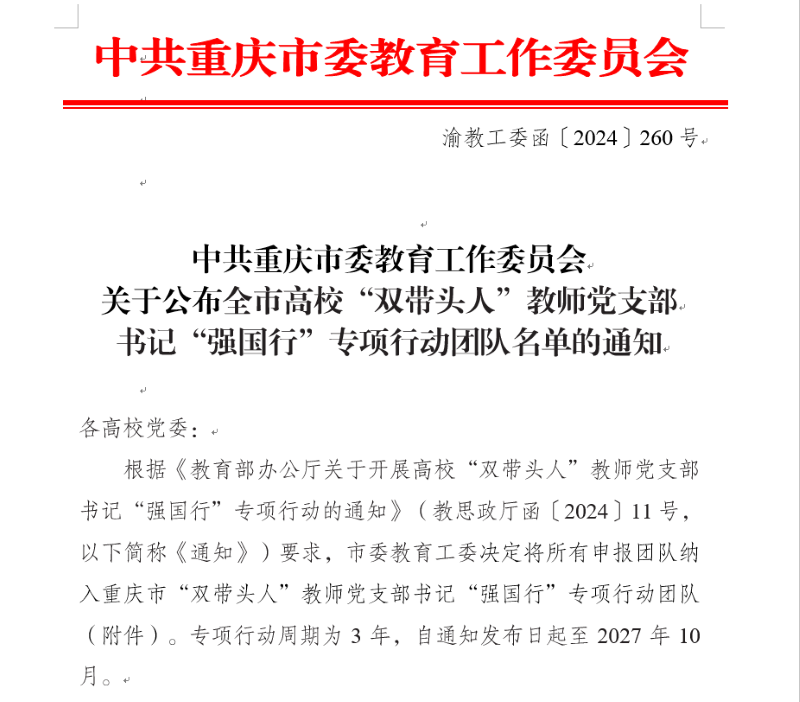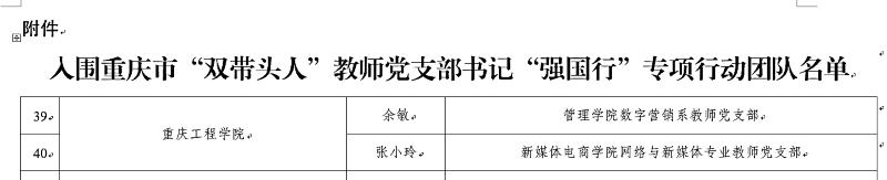 本网讯(文/图 组织部 文列焰)近日,我校管理学院数字营销系教师党支部和新媒体电商学院网络与新媒体专业教师党支部入选重庆市高校“双带头人”教师党支部书记“强国行”专项行动。这标志着我校教师党建工作迈上了新台阶,也为我校进一步推动基层组织党建工作与业务工作深度融合提供了新契机。