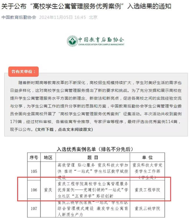 本网讯(图文/ 学生处 祝毅)近日,中国教育后勤协会(协会接受教育部、民政部的业务指导和监督管理)学生公寓管理专业委员会面向全国高校开展了“高校学生公寓管理服务优秀案例”征集活动,我校《党建引领的“一站式”学生社区“五育并举”路径创新》工作案例成功入选。