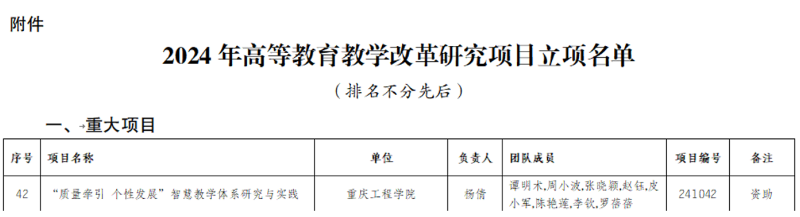 7月,立项重庆市高等教育教学改革研究项目9项,其中教务处处长杨倩教授主持的《“质量牵引 个性发展”智慧教学体系研究与实践》获得立项(渝教高函〔2024〕32号),使我校突破了重庆市重大有经费资助教改项目。