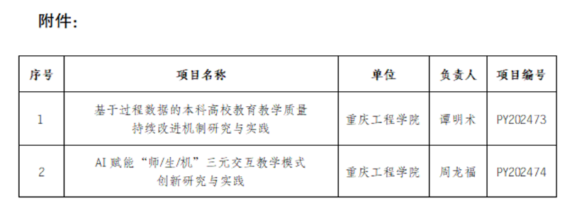 8月,副校长谭明术主持的《基于过程数据的本科高校教育教学质量持续改进机制研究与实践》,校长助理周龙福主持的《AI赋能“师/生/机”三元交互教学模式创新研究与实践》2个项目,获得重庆市高等教育教学改革研究“本科教学成果培育揭榜挂帅”专项项目立项(渝教高函〔2024〕35号),为我校申报重庆市教学成果奖奠定了良好基础。