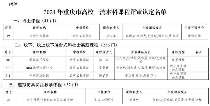 11月,《信息技术导论》等5门课程获得重庆市一流课程认定(渝教高函〔2024〕51号),其中线上课程1门,线下课程1门,线上线下混合式课程2门,虚拟仿真实验教学课程1门,认定数量并列民办高校第一。同时,《操作系统》等2门课程成功立项为重庆市本科高校课程思政示范项目。