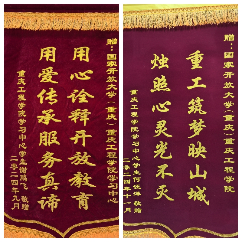 本网讯(文/图 创新中心 王锋)近日,国家开放大学重庆工程学院学习中心收到两份来自毕业生谢鹏飞和何汪洋的特别礼物——两面锦旗,锦旗上面分别镌刻着“用心诠释开放教育,用爱传承服务真谛”“重工筑梦映山城,烛照心灵光不灭”,字里行间流露出对母校的深情厚谊,感激之情溢于言表。这两份礼物不仅是对两人成长经历的见证,更是对学校教育工作的高度赞扬和肯定。