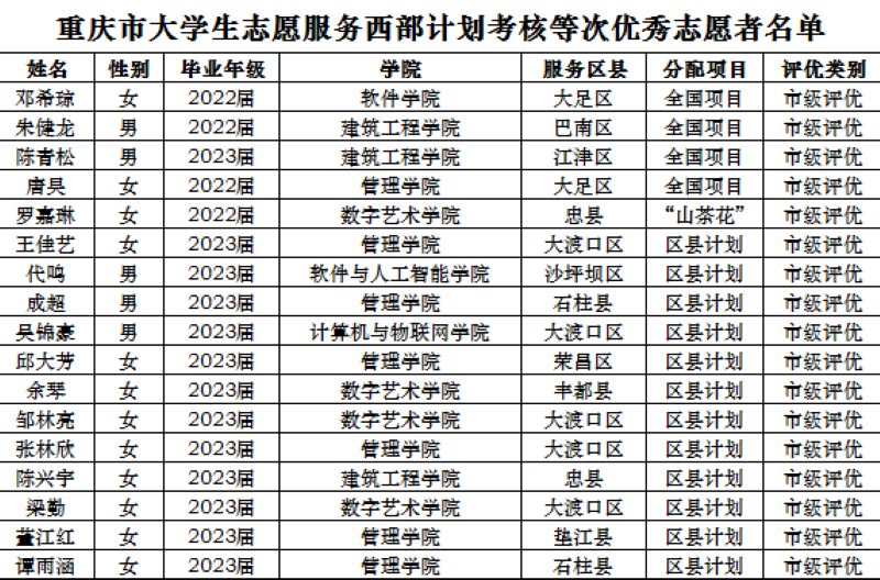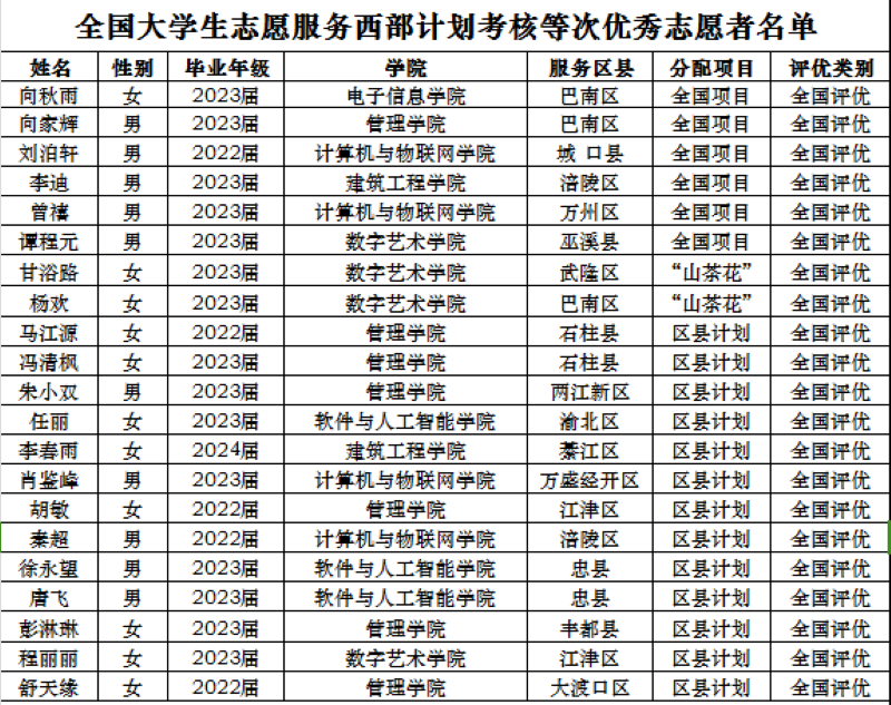 本网讯(文/图 校团委 张俊)近日,经西部计划全国项目办、市西部计划项目办分别审定,重庆市西部计划项目办正式发布了《2023—2024 年度大学生志愿服务西部计划考核等次优秀志愿者名单的通知》(渝项目办〔2024〕12 号),我校2023届管理学院向家辉等21名西部计划志愿者荣获全国优秀等次,2022届软件学院邓希琼等17名西部计划志愿者荣获市级优秀等次。