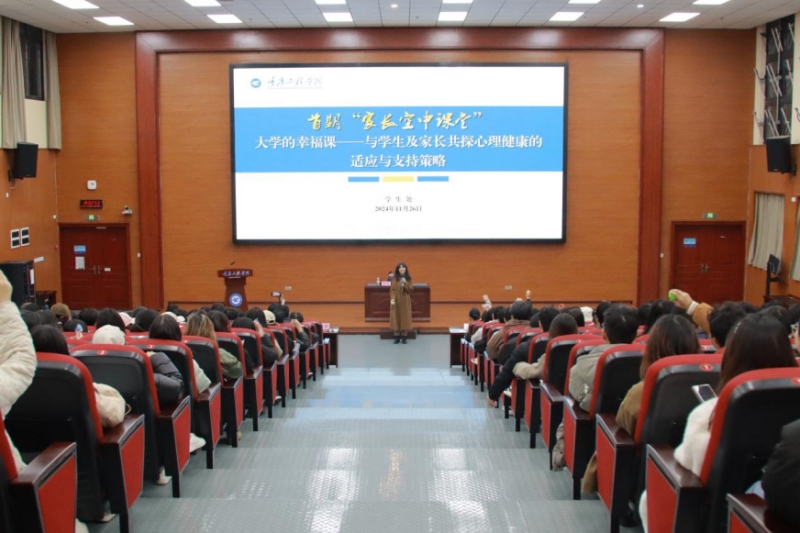 本网讯(文/图 学生处 李鹏)为深入贯彻心理健康教育重要理念,加强家校联动,全方位护航大学生健康成长成才。重庆工程学院于11月26日晚在7807报告厅举办了首期家长空中课堂——“大学的幸福课:与学生及家长共探心理健康的适应与支持策略”专题讲座。本次讲座由重庆医科大学学工部副部长、重庆市首届高校心理健康教育专家指导委员会委员、国家二级心理咨询师周恒教授主讲,全校300余名学生、700多位家长及教师代表通过线上线下结合的方式参与。