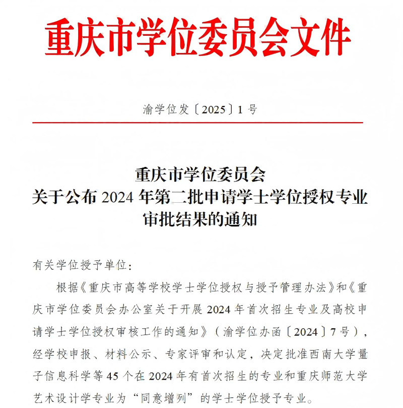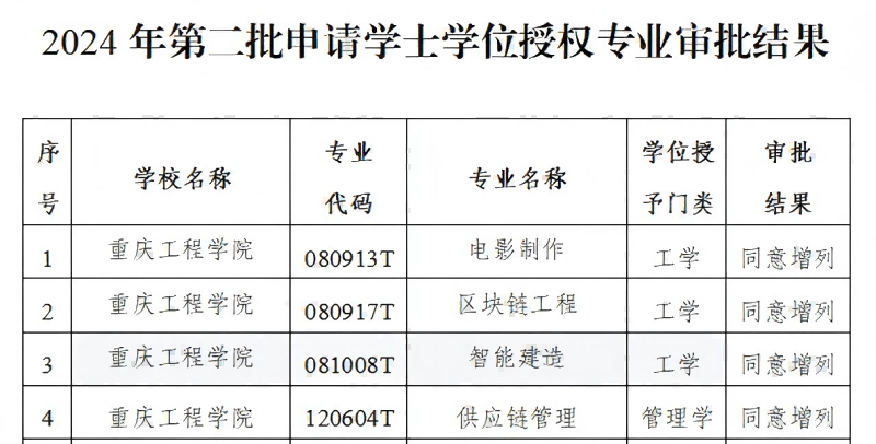 本网讯(文/图 教务处 张妍)近日,重庆市学位委员会发布《关于公布2024年第二批申请学士学位授权专业审批结果的通知》(渝学位发〔2025〕1号)文件,我校区块链工程、智能建造、电影制作和供应链管理四个专业学士学位授权审批结果为“同意增列”,顺利获得学士学位授予权。