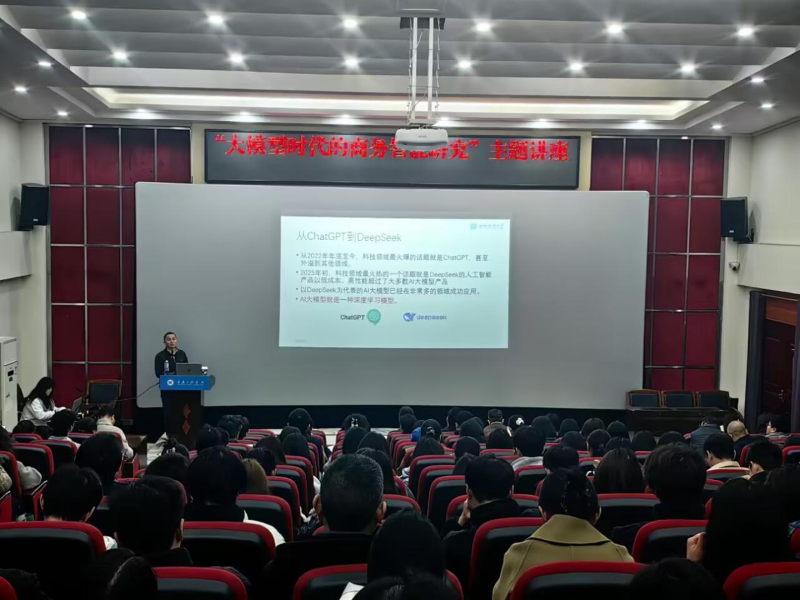 本网讯 (文/图 科技处 李世毅)为进一步浓厚我校学术氛围,3月21日,科技处邀请西南财经大学计算机与人工智能学院教授、西南财经大学“光华百人计划”学者、第十二批四川省学术和技术带头人后备人选邱江涛博士来校进行“大模型时代的商务智能研究”主题讲座。大数据与人工智能学院、管理学院、新媒体电商学院部分师生参加讲座。