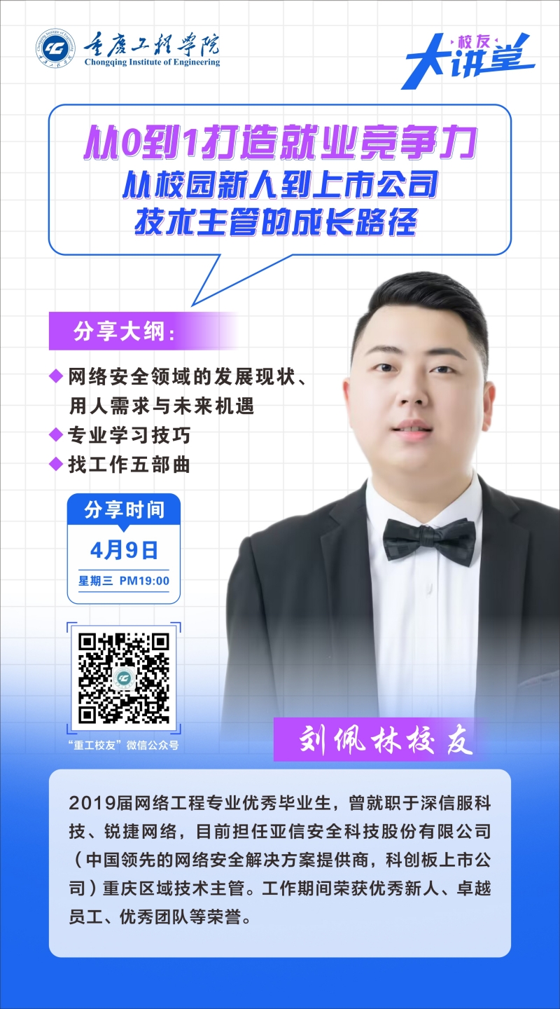 本网讯(文/图 就业指导中心 叶秋清)为充分发挥优秀校友的榜样引领作用,助力在校生科学规划学业生涯,4月9日晚,2019届网络工程专业校友刘佩林通过“重工校友”微信公众号“校友大讲堂”线上平台,开展题为《从0到1打造就业竞争力——从校园新人到上市公司技术主管的成长路径》的专题分享,吸引了3400余名学生参加。作为亚信安全科技股份有限公司重庆区域技术主管,刘佩林结合自身深耕网络安全行业的职业经历,为学弟学妹们深度解析就业规划与职场进阶路径。