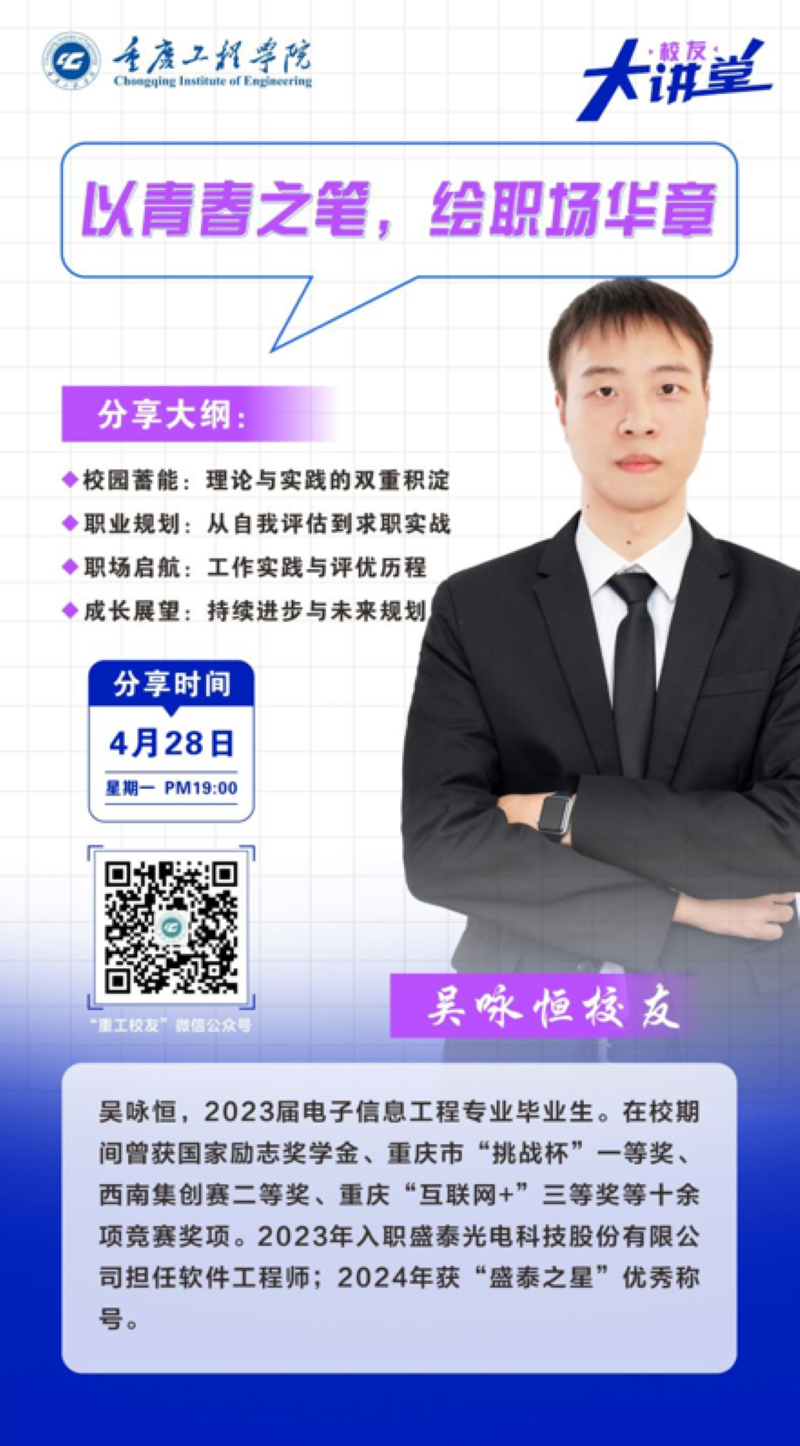 本网讯(文/图 就业指导中心 叶秋清) 4月28日晚,学校就业指导中心举办校友大讲堂线上交流活动,2023届电子信息工程专业校友吴咏恒通过鹅直播平台,以“以青春之笔,绘职场华章”为主题,向1300余名在校学子分享了软件工程师的职业发展经验。