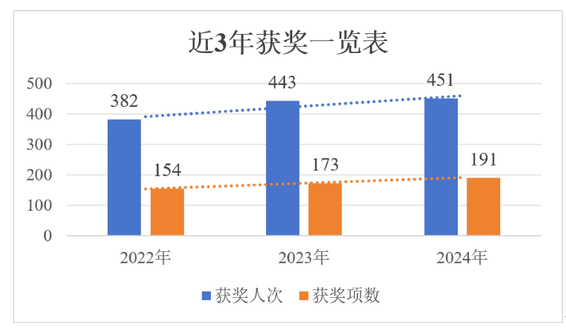 近三年的学科竞赛获奖如下图7所示,两组数据通过连续三年的阶梯式增长,明显看出获奖规模与成果数量 “双提升”的积极态势,展现了整体实力持续进阶的显著成效。
