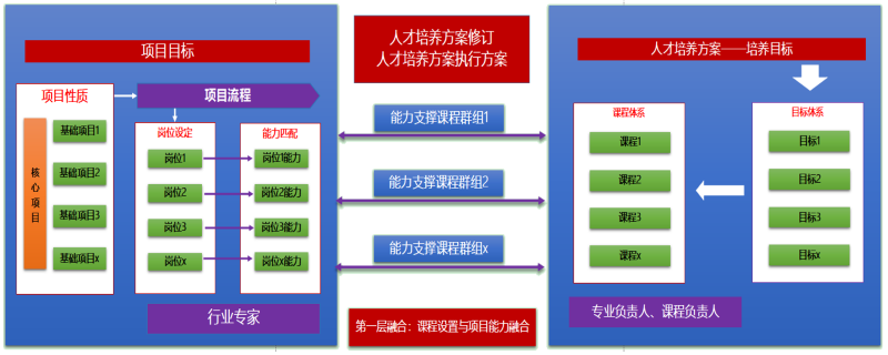 第一层融合:课程设置与项目能力融合。本层融合解决的关键性问题是专业人才培养方案设置问题,重点解决课程与项目需求能力支撑度、课程开设与项目开展适应度的问题。学院一是召集行业专家、项目负责人,对拟定开展的商业项目进行项目流程分析,确定项目开展中的岗位设定(专业培养目标中的典型工作岗位),明确各岗位的能力要求;二是组织专业负责和课程负责人,根据专业人才培养方案中培养目标体系与课程体系进行对应关系分析,依据各岗位的能力要求,划定能力支撑课程群组。此过程中,结合国标可增加、删除和修改部分课程设置,形成专业人才培养方案修订和专业人才培养方案执行方案。三是实施学生多岗位实践的机制