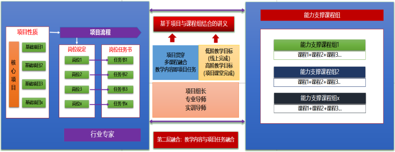 第二层融合:教学内容与项目任务融合。产教深度融合,需要突出“学做一体,学以致用”的培养特色,关键在于教学内容与项目内容融合。学院与项目组充分沟通,确定岗位任务书,明确工作任务,再将其与能力支撑课程组的教学大纲、教学内容对接,根据实际工作任务调整教学内容,采用“项目贯穿、多课程融合”思路,组织项目组长、专业导师和实训导师共同编写基于项目与课程深度融合的讲义,这是实现产教深度融合的关键环节。