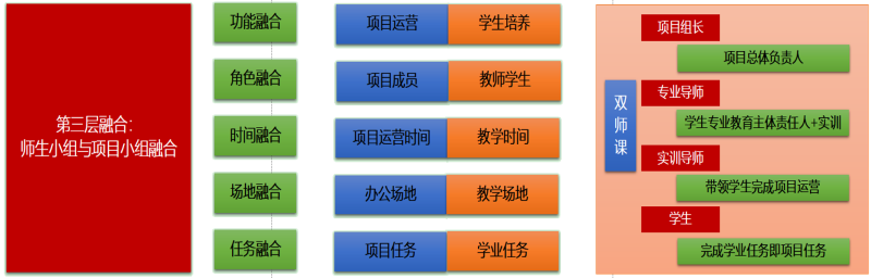 第三层融合:师生小组与项目小组融合。在产教深度融合中,项目运营与教学过程需要达到任务融合、场地融合、时间融合、角色融合和功能融合,采取双师课堂(专业导师+实训导师),共同带领学生(项目组成员),同步完成项目任务和教学任务,过程中可有工学交替阶段安排。这既可为师生营造真实的工作环境,也可为师生打造难得的学习环境,教师在专业导师和实训导师、学生在在校学生和项目成员之间动态转换身份,真实落地产教深度融合。同时赛、创结合,将优秀学生吸收为项目合伙人,条件成熟时,孵化并支持学生创业,使学院学生成为创业者最多的学院。