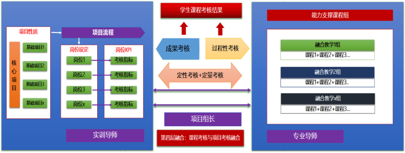 第四层融合:课程考核与项目考核融合。基于产教深度融合的项目制教学,根本目的在于提升学生的学习能力和应用能力。项目运营可让学生快速地让感知专业能力欠缺,明确学习方向;基于项目的课程教学是为帮助学生补强专业能力,解决项目运营过程中存在的问题。实训导师根据岗位任务设定岗位KPI考核指标,在项目运营过程中采取定性和定量相结合的、偏重于项目成果的考核;专业导师根据配合岗位补强任务的教学,在学习过程中采取过程性考核;项目成果考核和学习过程考核,共同组成学生课程考核。