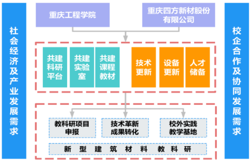 在建筑材料行业蓬勃发展的当下,建筑工程学院积极响应国家政策导向,深入践行学校“校企合作、产教融合”人才培养模式,不断完善“4321”产教融合体系,与重庆四方新材股份有限公司在科研、项目申报、技术研发与成果转化、人才培养等多领域深入合作,以实现教育供给与产业需求的精准对接。重庆四方新材股份有限公司(以下简称“四方新材”)是一家上市公司,在建筑材料尤其是混凝土材料研发、生产、销售方面业绩突出,具有较强的社会知名度。而我校建筑工程学院拥有专业的师资队伍、完善的科研设备以及浓厚的学术氛围。校企双方协同合作,促进资源互补,一方面利用校企双方研究条件,发挥教师的专业优势,共同推动基于混凝土材料节能环保技术、建筑材料功能提升等方面的研究,助推四方新材产品更新升级以及优化产品线、产品结构;另一方面,依托四方新材提供的市场信息以及建筑材料技术应用动态,助推学校课程改革,以及在社会服务方面发挥更大作用,提高人才培养质量,增强学院的社会服务能力。