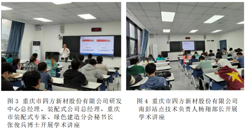 科研平台也为学术交流创造了条件,累计举办学术讲座10余次,吸引了800余名师生参与。例如,2023年11月邀请了张俊兵博士作《预拌混泥土生产质量控制及常见问题分析》、杨翔部长作《重庆市绿建新标准与装配式建筑两板产品体系分析》等学术讲座,反响强烈,为老师和学生开展科学研究打下了坚实的基础。