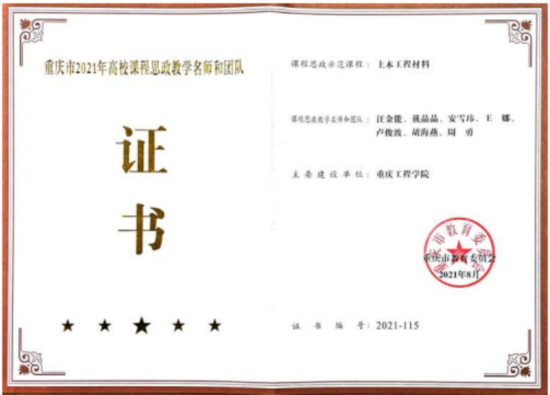 课程与教材建设成果丰硕,多渠道助力人才培养。随着产教融合的深入发展,校企双方在共建课程与教材方面也取得了显著成果。《土木工程材料》课程荣获重庆市 2021 年高校课程思政示范课称号,成功地将思政教育与专业教学相结合,致力于培育学生的专业道德和社会责任感。同时,《土木工程材料》教材也于 2024 年被确立为校本教材建设项目,其编写过程中吸纳了众多企业实际案例和行业前沿技术,确保了教材内容的丰富性、全面性和实用性。