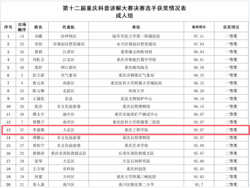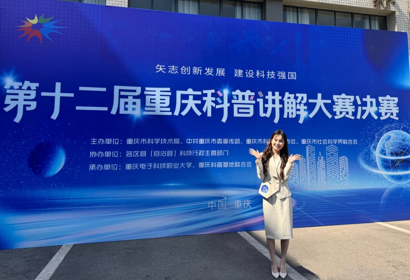 本网讯(文/图 双桥校区管委会 杨双溢)5月11日,第十二届重庆市科普讲解大赛决赛拉开序幕。重庆工程学院双桥校区选送的李盈颖同学,代表大足区前往重庆电子科技职业大学参加决赛。李盈颖凭借扎实的专业功底与出色的舞台表现力,从全市科普精英中脱颖而出,并以优异表现成功荣获第十二届重庆市科普讲解大赛二等奖。