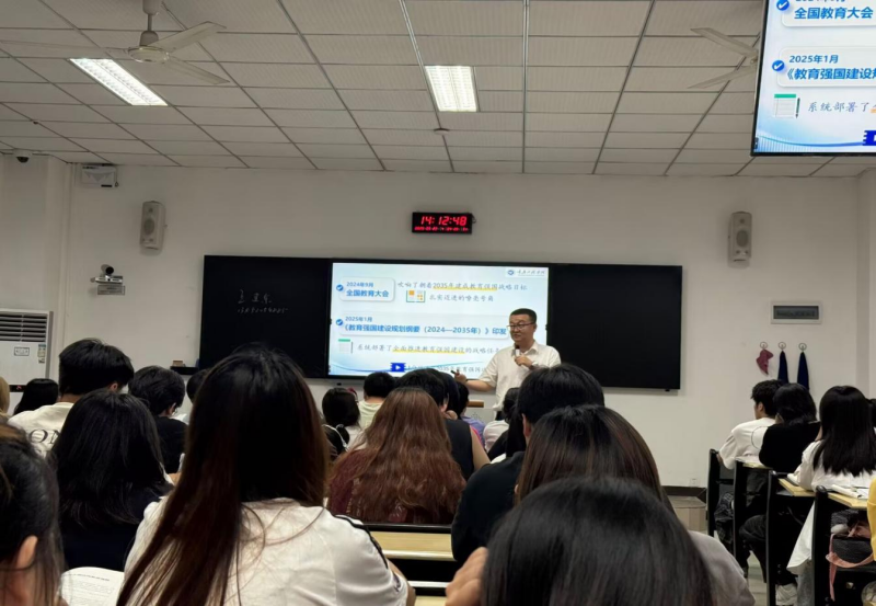 本网讯(文/图 马克思主义学院 程爱 )为充分发挥思政课铸魂育人主渠道、主阵地作用,提升思政课堂教学质量,5月22日,副校长王建东走进课堂,为南泉校区23营销6-7班学生讲授了“从教育大国迈向教育强国”的形势与政策课。