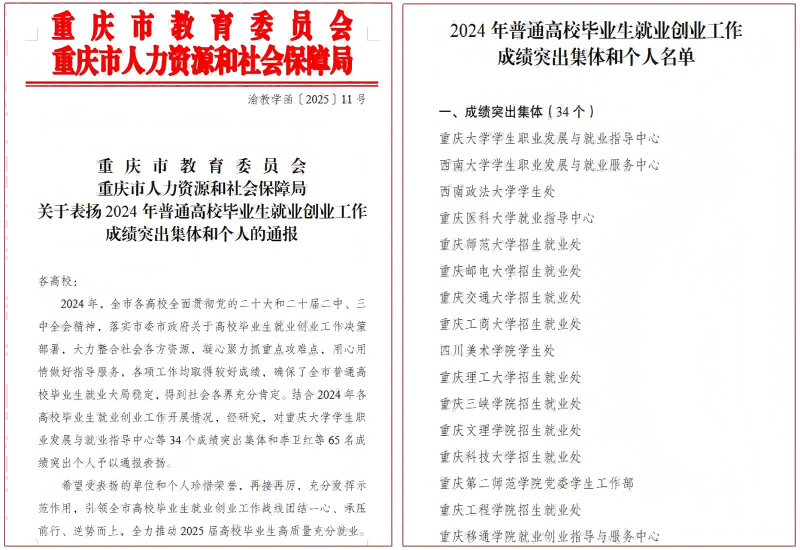 本网讯(文/图 就业指导中心 叶秋清)近日,重庆市教育委员会与人力资源和社会保障局联合印发《重庆市教育委员会、重庆市人力资源和社会保障局关于表扬2024年普通高校毕业生就业创业工作成绩突出集体和个人的通报》(渝教学函〔2025〕11号)。我校招生就业处获评“2024年普通高校毕业生就业创业工作成绩突出集体”,学校创新中心王锋获评“2024年普通高校毕业生就业创业工作成绩突出个人”。