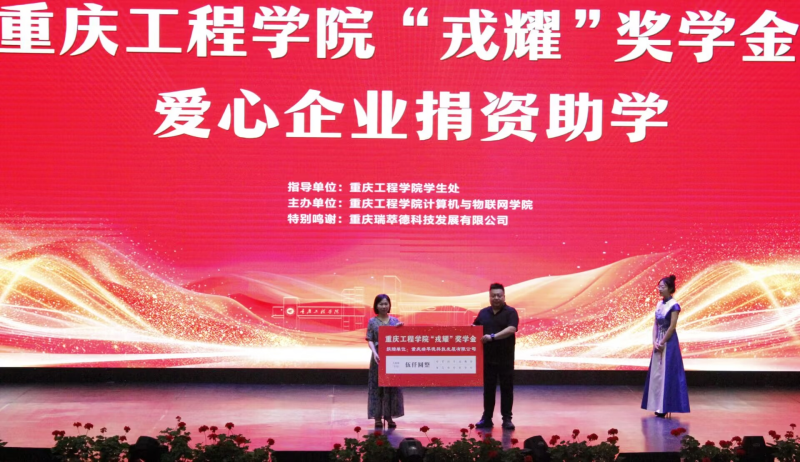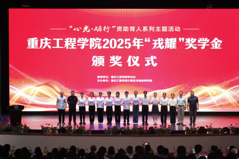 本网讯(文/图 计算机与物联网学院 王玲)5月26日下午,重庆工程学院2025年“戎耀”奖学金颁奖仪式在学术报告厅隆重举行。学校党委委员、副校长王建东,财务总监王小林,爱心企业重庆瑞萃德科技发展有限公司总经理曹怀志出席,“戎耀”奖学金捐赠教师代表和计算机与物联网学院师生代表1000余人齐聚一堂,共同见证了这一荣耀时刻。
