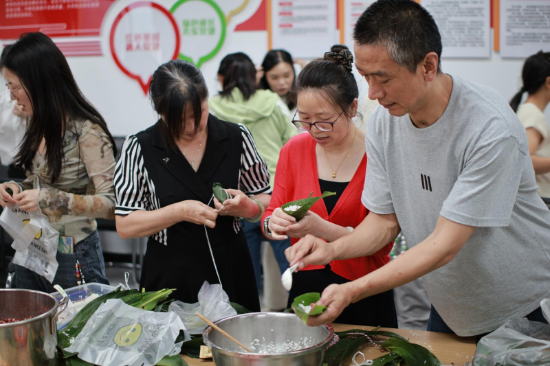 作为活动亮点,粽子现场教学与制作环节将传统节俗与家校互动巧妙融合。家属与师生齐聚7806会议室,捋粽叶、填糯米、裹形状、捆棉线,共同体验端午习俗的独特魅力。现场粽叶飘香、欢声笑语,孩子们与父母协作完成的手工粽子,不仅承载着节日的祝福,更成为家校情谊的生动见证。这一环节既让教职工在繁忙工作中享受亲子时光,也传递了学院对教职工家庭的深切关怀。