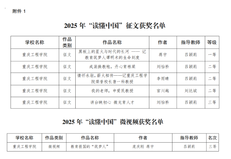 本网讯(文/图 学生处 吕颖莉)近期,渝教关办发〔2025〕19号文公布了2025年全市“读懂中国”活动获奖名单,我校上报的5篇征文作品、1部微视频作品全部获奖。其中,征文获一等奖1篇,二等奖3篇,三等奖1篇;微视频作品获三等奖。