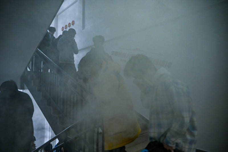 随着校园内消防警报响起,应急疏散演练正式启动。参与演练的悦园、静园社区同学们闻令而动,跟随疏散人员的引导,按照预定疏散路线,低姿弯腰、捂住口鼻,快速有序从宿舍楼撤离至指定安全区域。