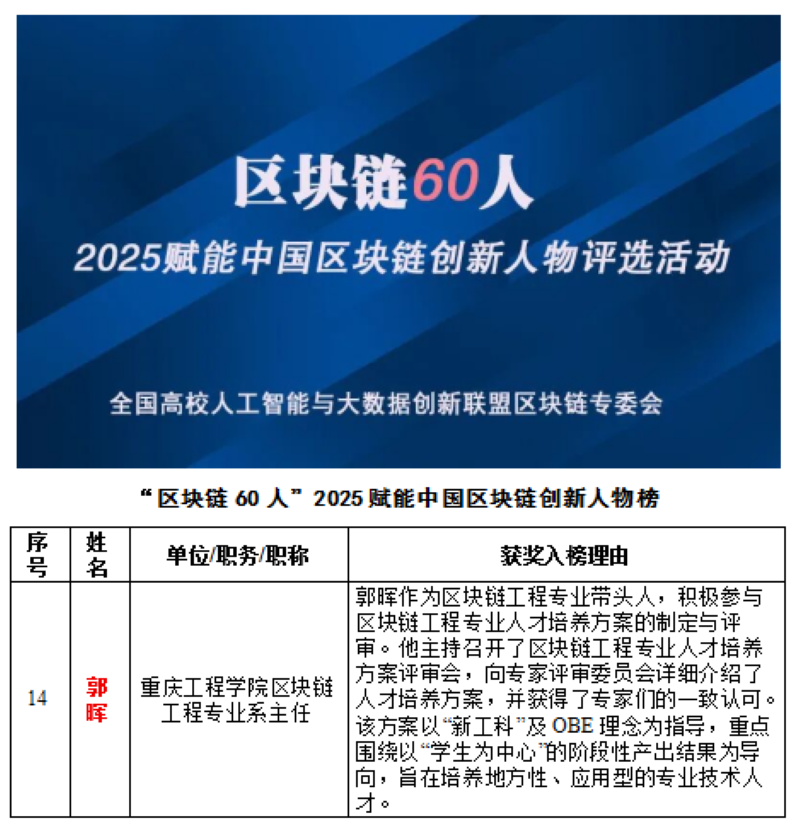 在此次论坛的颁奖环节,我校计算机与物联网学院区块链工程专业系主任郭晖,凭借其在区块链人才培养体系构建、技术创新与产业赋能等方面的突出贡献,荣获“区块链 60 人”2025赋能中国区块链创新人物奖。“区块链60人”创新人物评选致力于表彰在区块链技术研发、人才培养与产业应用等领域作出重要贡献的行业领军人才。这一荣誉的获得,既是对郭晖个人专业能力的认可,更集中体现了我校在区块链领域建设的系统性成果与前瞻性布局。