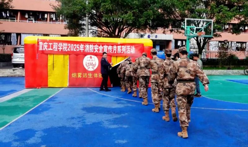 随着警报声响起充气式逃生屋被白色浓烟瞬间吞噬。屋内曲折通道蜿蜒交错,障碍物与死胡同暗藏其中,能见度不足半米,刺鼻气味逼真还原火灾现场的紧迫氛围。