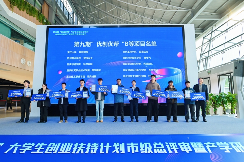 本网讯(文/图 创新创业学院 吴乐乐)1月10日,第九期“优创优帮”大学生创业扶持计划市级总评审暨产学研合作资源对接会在西部(重庆)科学城大创谷・梦花园圆满落幕。本次活动由重庆市教育委员会、重庆高新区联合主办,市学生就创中心、重庆高新区政务服务中心、重庆工程学院等单位共同承办。我校“百家生态”获评B类立项并获资金扶持,“影格传媒”被认定为优秀创业项目,创我校近五年最好成绩!