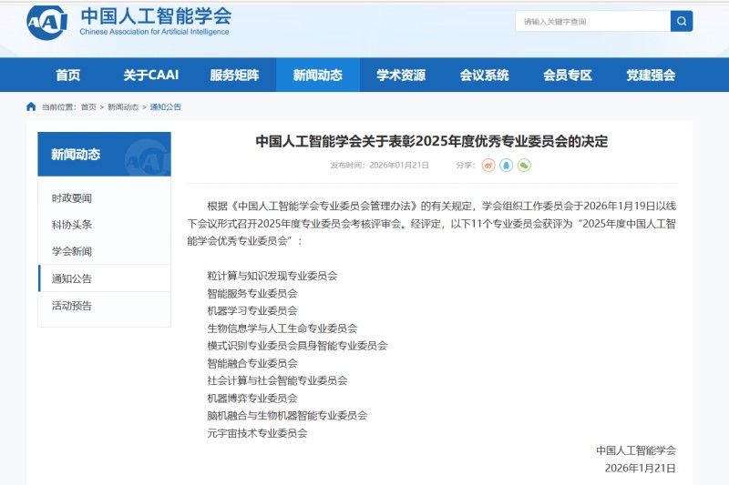本网讯(文/图 软件学院 孟丽娟)据中国人工智能学会官网消息,我校软件学院教授张小川带领的机器博弈专业委员会获评为“2025年度中国人工智能学会优秀专业委员会”。