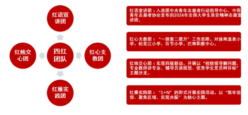 软件学院软件工程专业学生第一党支部作为首批重庆市党建工作样板支部和第三批全国党建工作样板支部,支部抓牢党建工作“红色引擎”,建好“红语宣讲团”“红心支教团”“红烛交心团”“红雁实践团”四支团队;夯实“五红教育”,开展访红色基地、读红色书籍、讲红色故事、进红色课堂、悟红色精神系列学习教育活动,并将系列活动有机融入“三会一课”、主题党日活动中,创新活动形式,深化活动内涵,不断提升党员教育针对性和实效性,激发党组织活力。