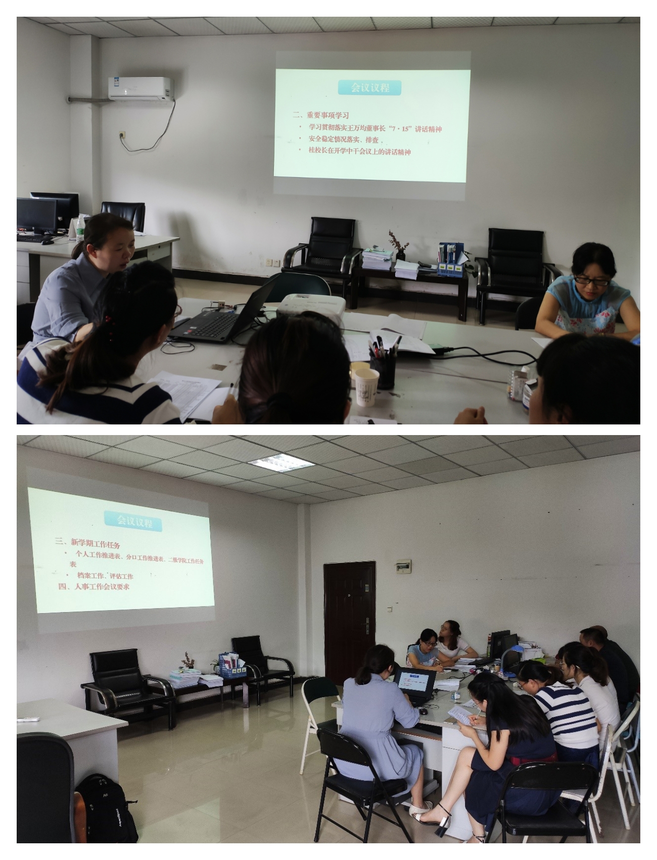 首先李静处长带领全处人员学习了王万均董事长7·15讲话文件,认真领会文件精神,特别强调将“进取、担当、务实、高效”八字方针要用于日常工作中,提高教务处工作质量。同时,李处长还强调了新学期安全稳定问题,提出大家要高度重视办公室、教室的安全问题,排查安全隐患。李静处长与赵友贵副处长于9月1日已走遍了六教、一教、五教、实训楼等教学场地,全面检查了各方面的安全问题与开课前准备情况。