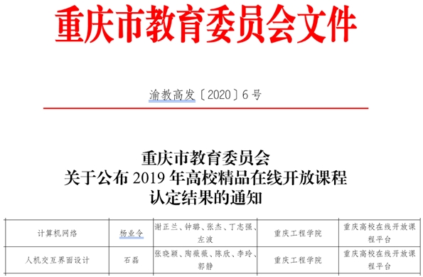 根据《重庆市教育委员会关于公布2019年高校精品在线开放课程认定结果的通知》(渝教高发〔2020〕6号)公布的结果,我校杨业令老师申报的《计算机网络》和石磊老师申报的《人机交互界面设计》2门在线开放课程,被认定为重庆市高校精品在线开放课程。据了解,重庆市教委于 2017年启动首批重庆市高校精品在线开放课程认定工作,在各校推荐申报的基础上,专家对内容质量、学术水平、课程应用共享效果等方面进行综合审议,最终认定并公示出精品在线开放课程。截至目前,我校共有4门课程被认定为重庆市精品在线开放课程。