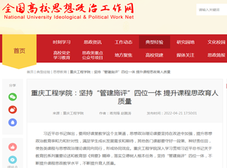 4月21日,全国高校思想政治工作网以《坚持“管建施评”四位一体提升课程思政育人质量》为题,全面系统的介绍了我校课程思政育人典型经验。该网是教育部主管、教育部思政司指导、高等教育出版社负责具体建设和运行维护的服务高校思想政治工作的专业性门户网站,是全国高校思政工作的资源集散库、思想文化策源地和宣传舆论风向标平台,是发挥示范引导、辐射带动作用的思政工作网络育人主阵地。学校课程思政育人经验得到该网站的肯定,将进一步助推学校课程思政教学工作,激发广大教职员工的课程思政教学工作热情,为培养更多合格的社会主义建设者和接班人服务。