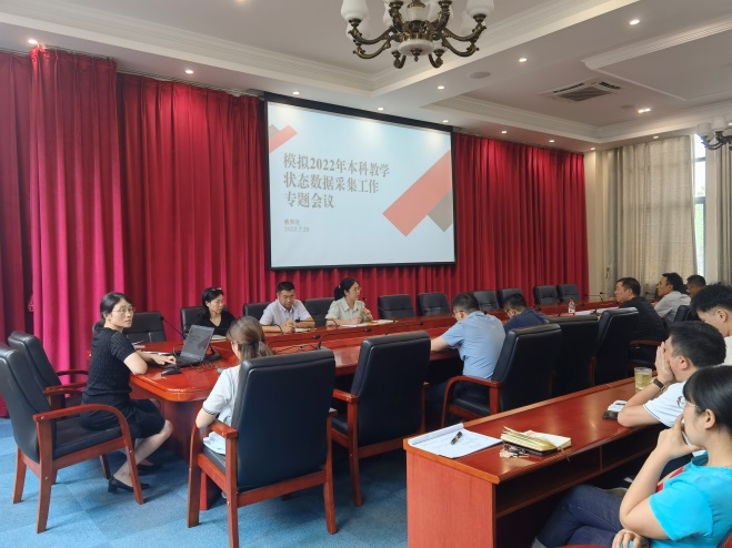 为做好2022年本科教学状态数据采集工作, 7月20日下午在行政楼206会议室召开了模拟2022年本科教学状态数据采集工作专题会议。会议由教务处副处长陈艳莲主持,相关职能部门负责人、各二级学院分管教学副院长、数据采集相关人员参加会议。