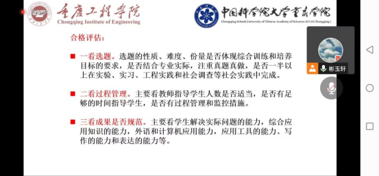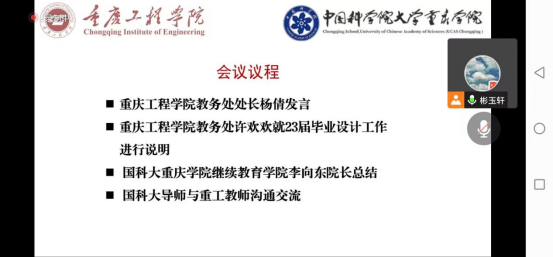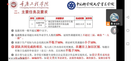 为进一步做好“第二届卓越工程师班”毕业设计工作,确保学校与国科大重庆学院在毕业设计工作上能够密切协同、步调一致、同步推进。11月15日上午,学校与国科大重庆学院通过腾讯会议召开“第二届卓越工程师班”人才培养研讨会,学校教务处处长杨倩、实践科许欢欢,各二级学院教学副院长,负责毕业设计相关教师。国科大继续教育学院院长李向东、卓越工程师班指导教师以及相关人员参加会议。