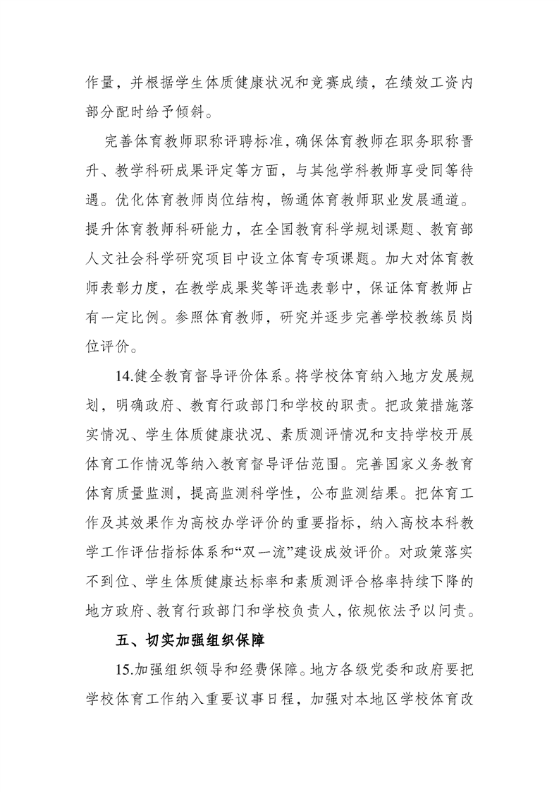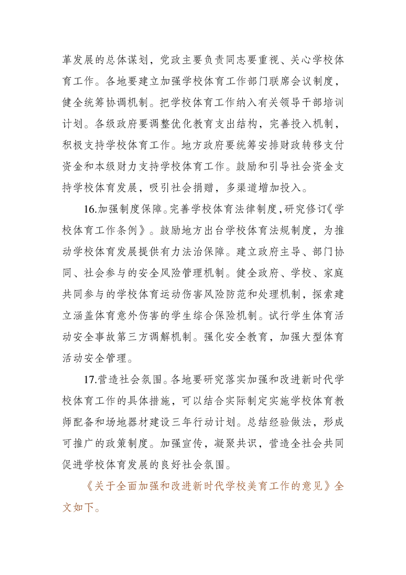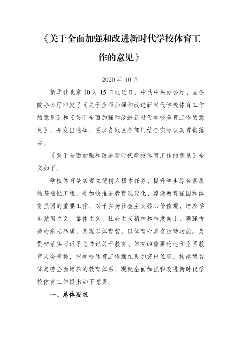 关于全面加强和改进新时代学校体育工作的意见